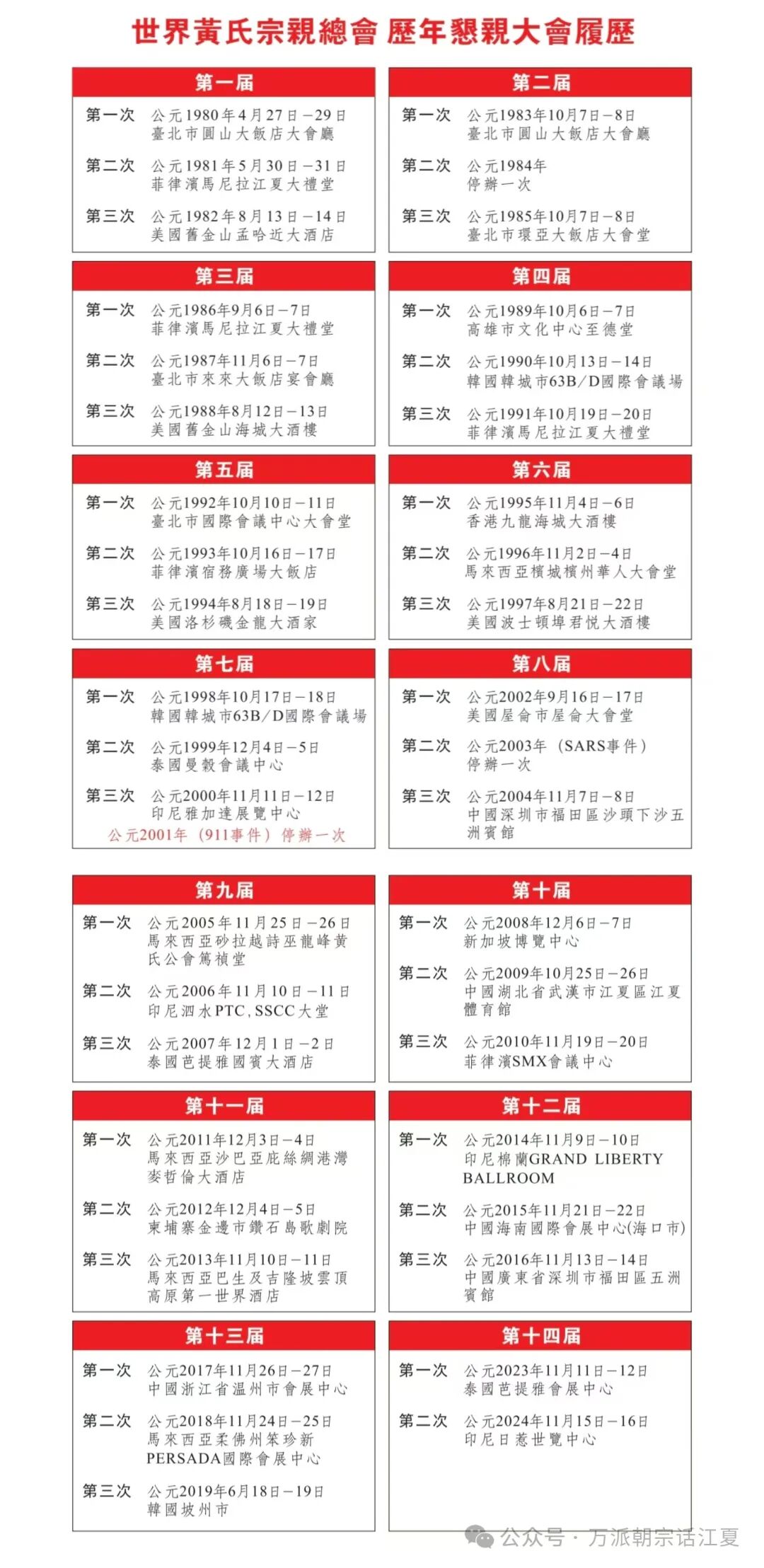 世界黄氏宗亲总会为了敦亲睦族,联络宗谊,每年都在各国举办世黄恳亲大会。承蒙世界黄氏宗亲总会以及各国分会的支持与厚爱,今年由印尼江夏堂黄氏总会主办“世界黄氏宗亲总会第十四届第二次恳亲大会”。再次祝贺世界黄氏宗亲总会第十四届第二次恳亲大会圆满成功!2025年,世界黄氏宗亲总会第十四届第三次恳亲大会再聚首